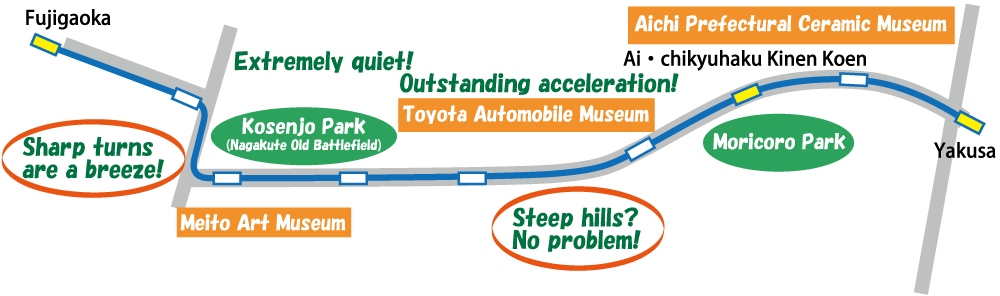 The Linimo can be chartered from Fujigaoka Station to Ai・Chikuhaku Kinen Koen Station or Yakusa Station.